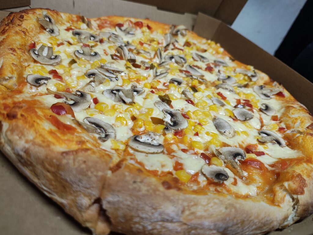 Salsa de tomate especial, Pimenton, Choclo, Cebolla, Champiñones, Aceitunas, Extra queso.