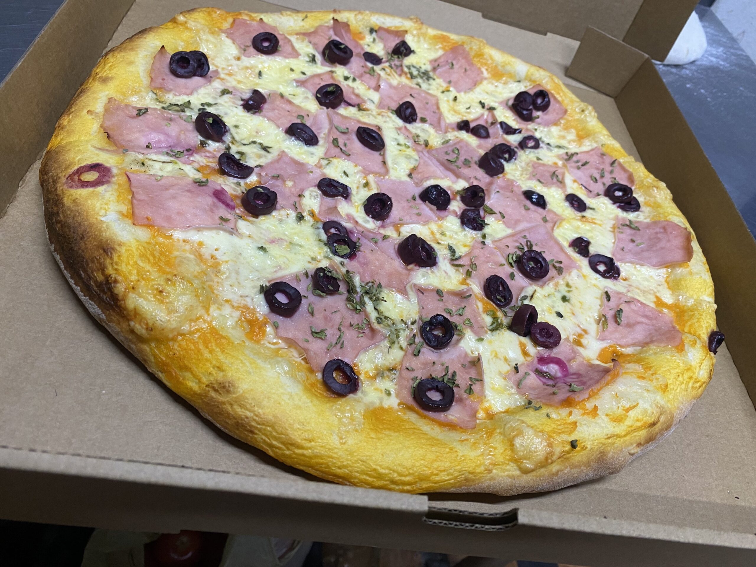 Ingredientes: Salsa de la casa, Queso mozzarella, Jamon, Aceite, Oregano